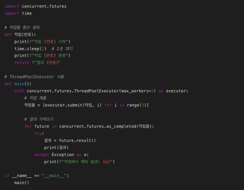 ThreadPoolExecutor는 Python에서 멀티스레딩을 간편하게 구현할 수 있는 유용한 도구입니다. 특히 I/O 바운드 작업에 적합하며, 성능을 향상시키는 데 큰 도움이 됩니다. 이 예제를 바탕으로 다양한 작업을 동시에 처리하는 프로그램을 작성해보세요!