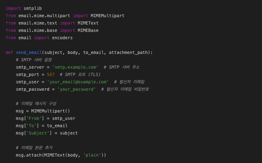 아래의 코드는 SMTP를 이용해 이메일 본문과 첨부파일을 보내는 기본적인 구조입니다.