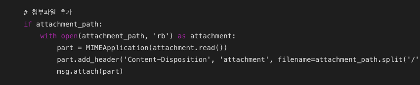 - 첨부파일 추가: 첨부파일을 열고 MIMEBase를 사용하여 첨부합니다. 파일을 인코딩하고 헤더를 설정합니다.