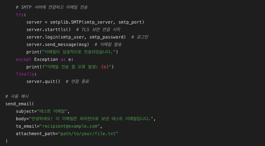 - 사용 예시: send_email 함수를 호출하여 이메일을 전송합니다.